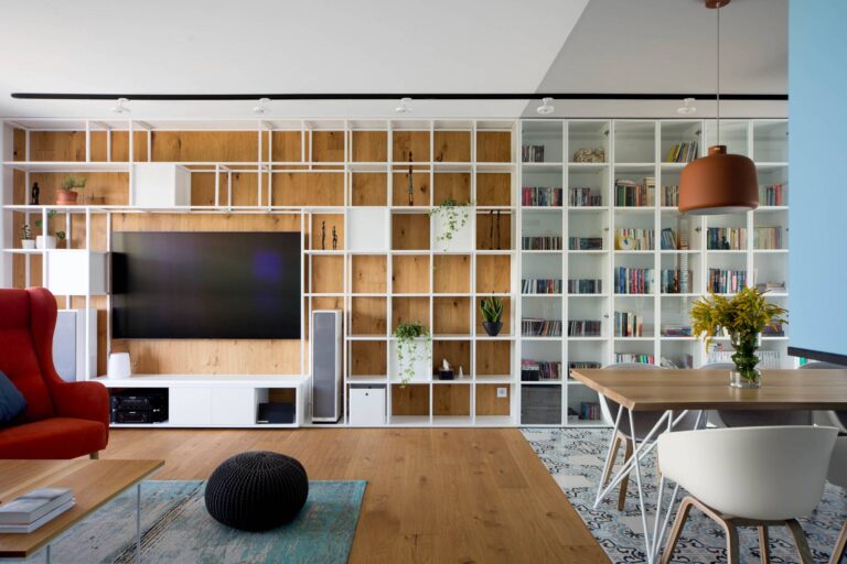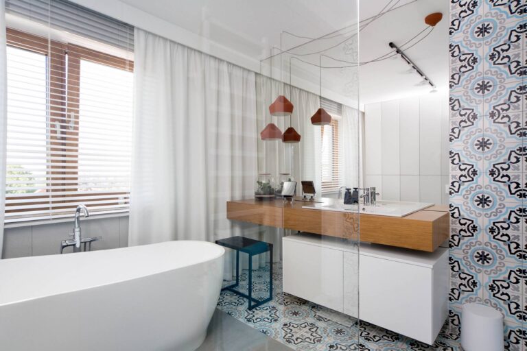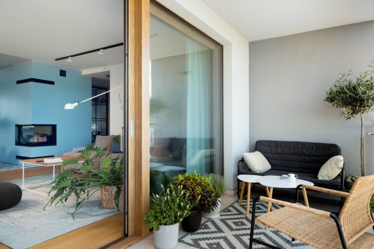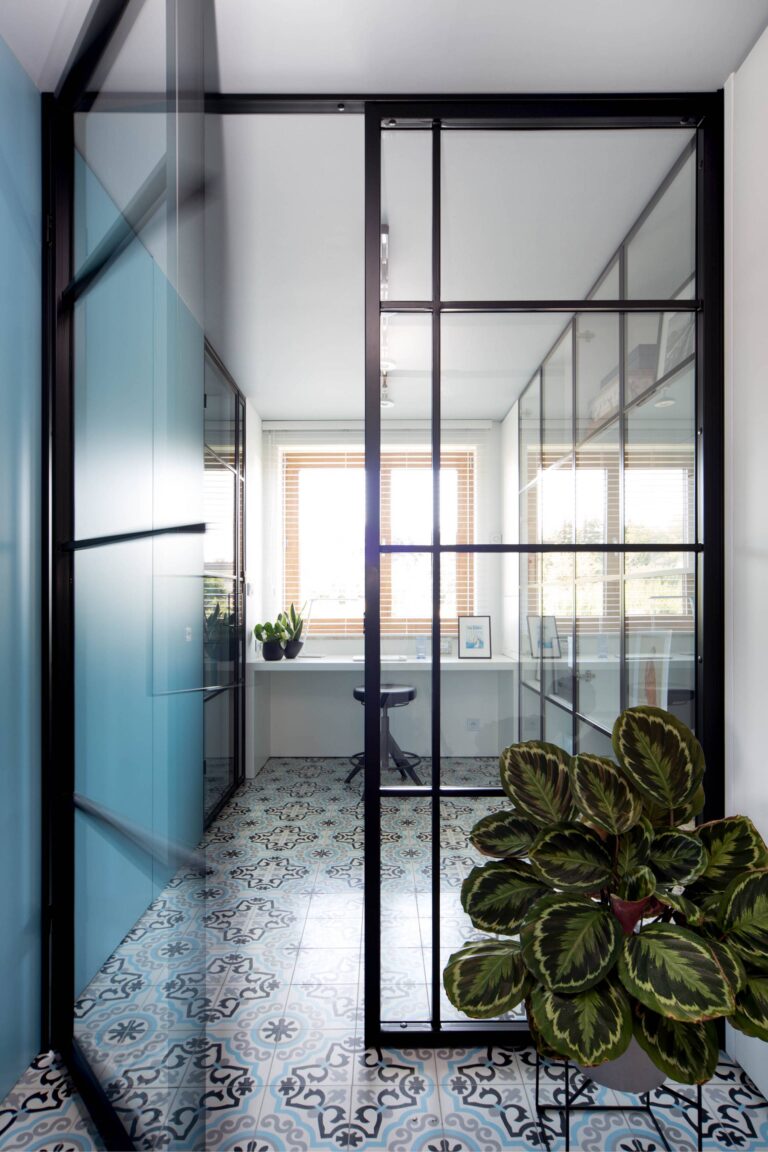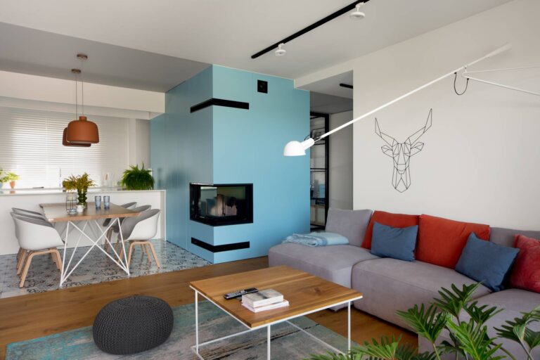 Układ zaproponowany przez architekta budynku był tradycyjny, ale mieszkanie miało jeden, nietypowy element – kominek na drewno. Sam komin znajdował się w środku mieszkania i to było nasze centrum, wokół którego zbudowaliśmy nowy układ. Nowy jeszcze bardziej otwierał przestrzeń i światło. Część ścian zastąpiliśmy loft-owym przeszkleniem, a łazienkę przenieśliśmy do pomieszczenia z oknem, gdzie powstała strefa spa.